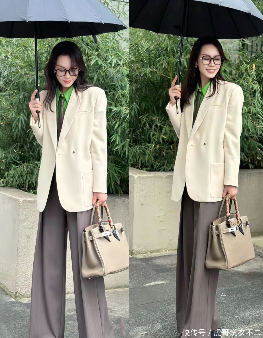 比如说图中这条西裤,就有着极其宽松的裤筒,不错在视觉上荫藏任何的腿部污点,中年女东谈主穿起来也会更闲静。
