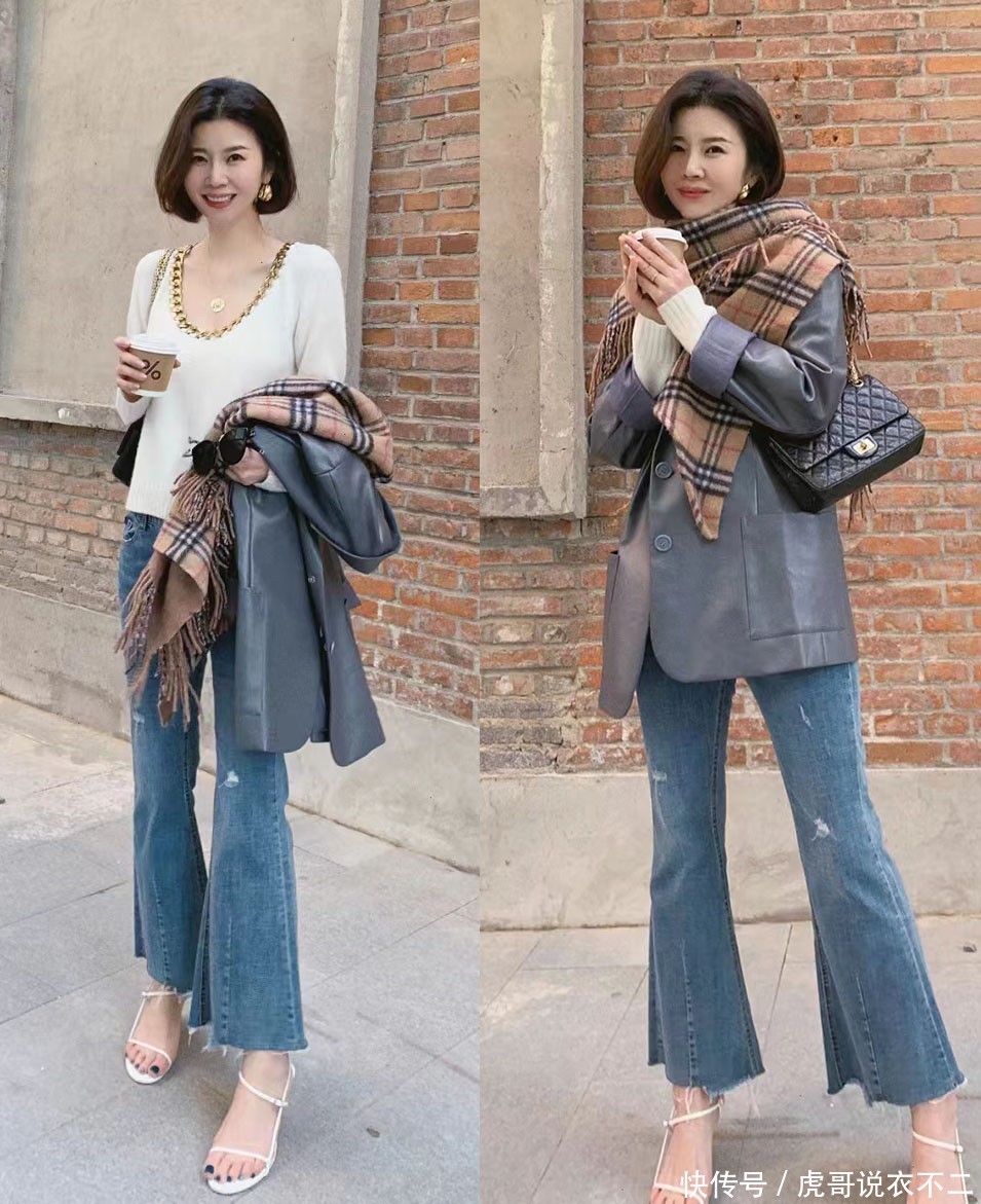 淌若说直筒裤不错呈现出又细又长的线条感,那么图中这条喇叭裤就具有拉伸双腿的优点,不错修饰的腿更长、体魄更好。况且牛仔面料的坚挺感,也能使喇叭版型保抓的更为立体、不会有软塌塌的嗅觉。